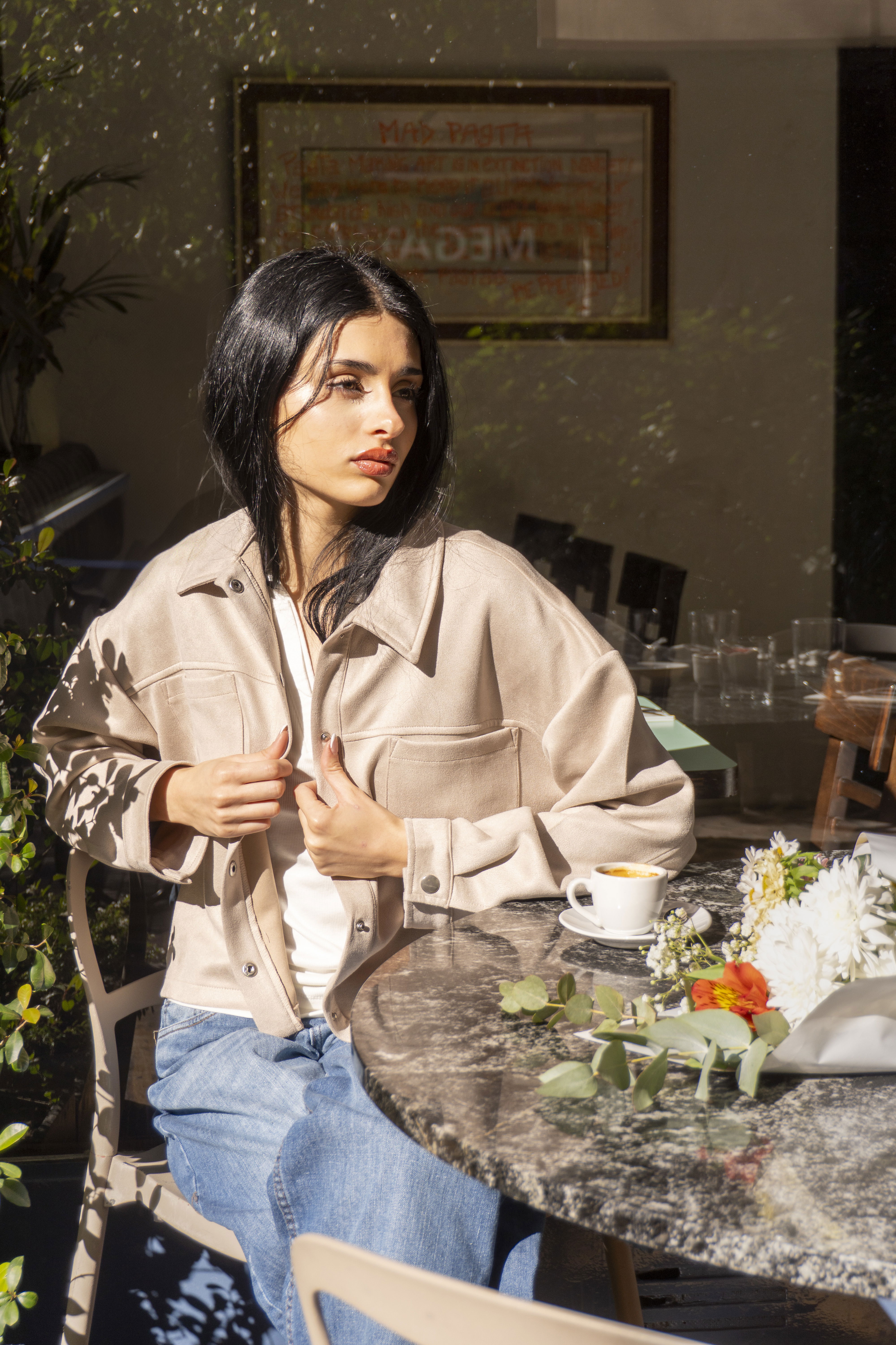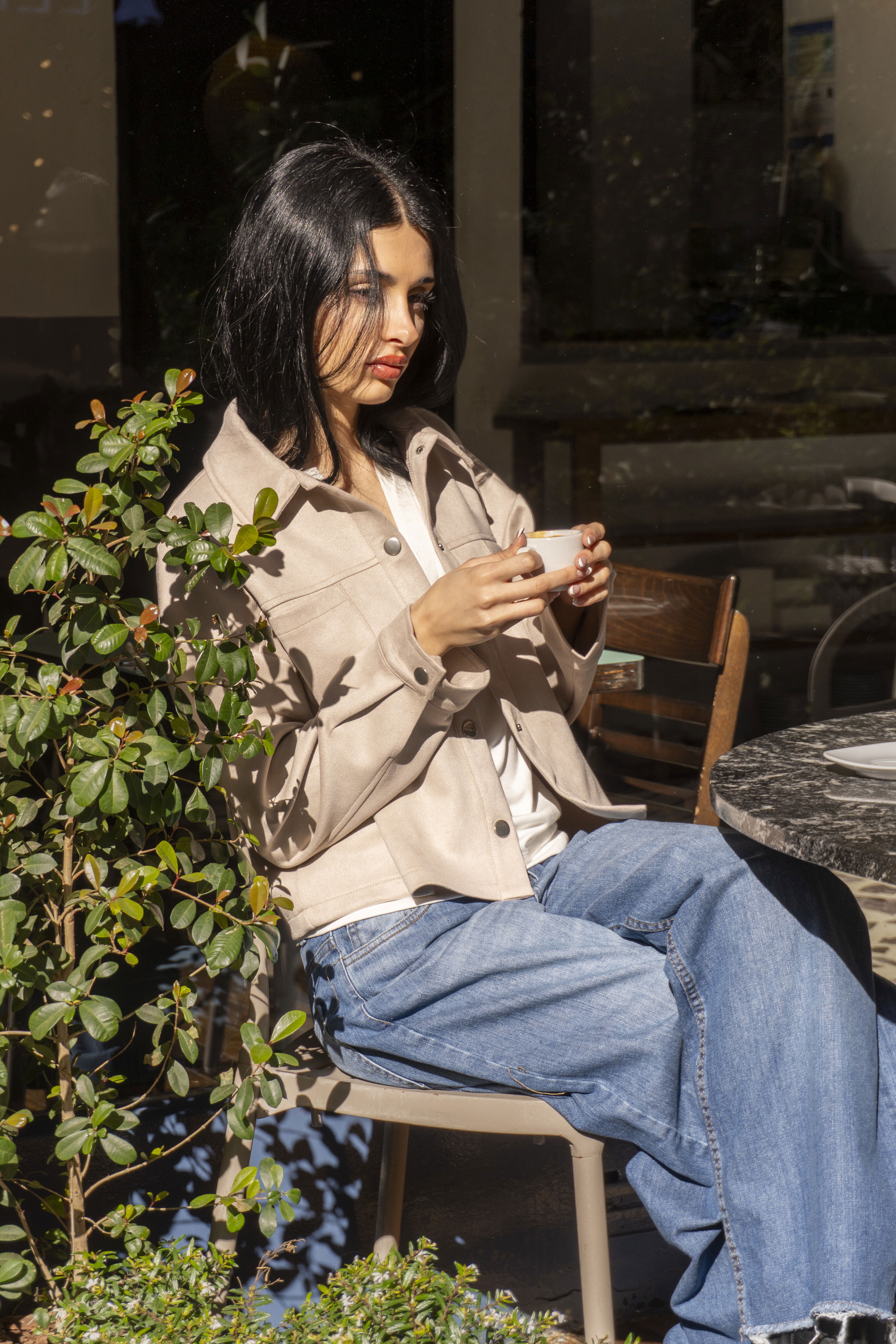 Saco liso de suede con bolsillos delanteros. Suave y delicado, suma un toque romántico y sofisticado a cualquier conjunto.