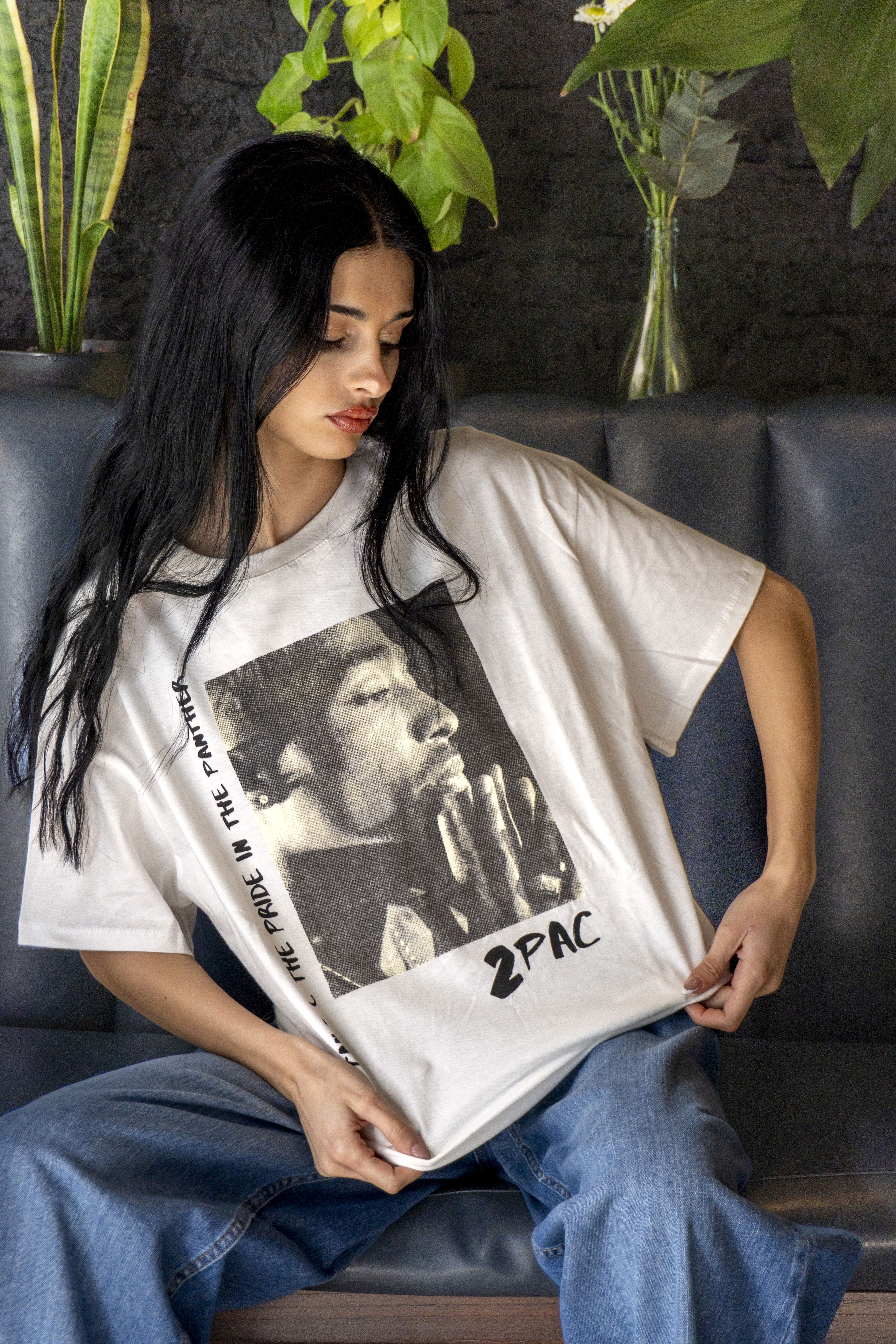 Remera de jersey de algodón, corte oversize y estampado de Tupac que le pone actitud a tu look. Talle único, cómoda y fácil de combinar.