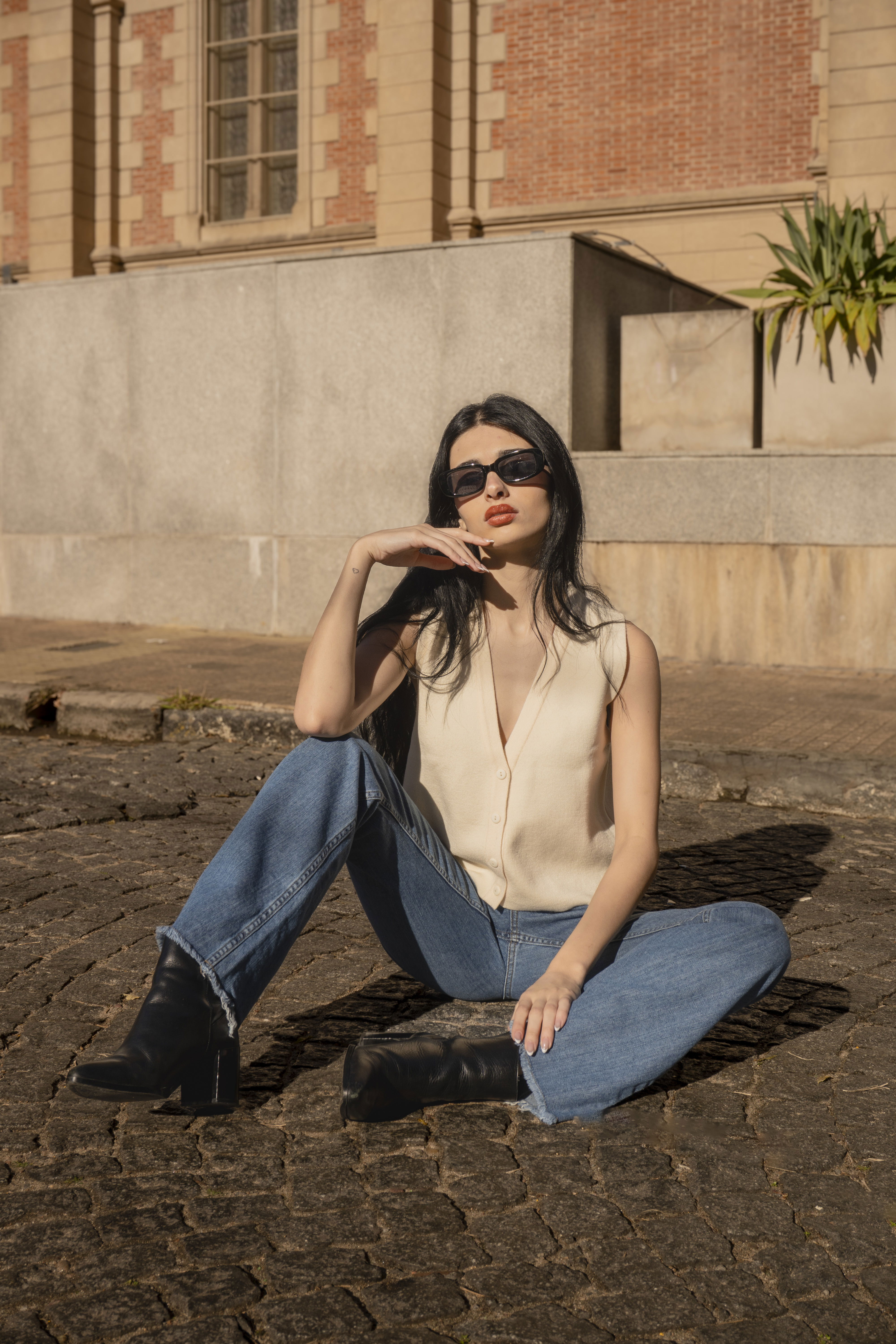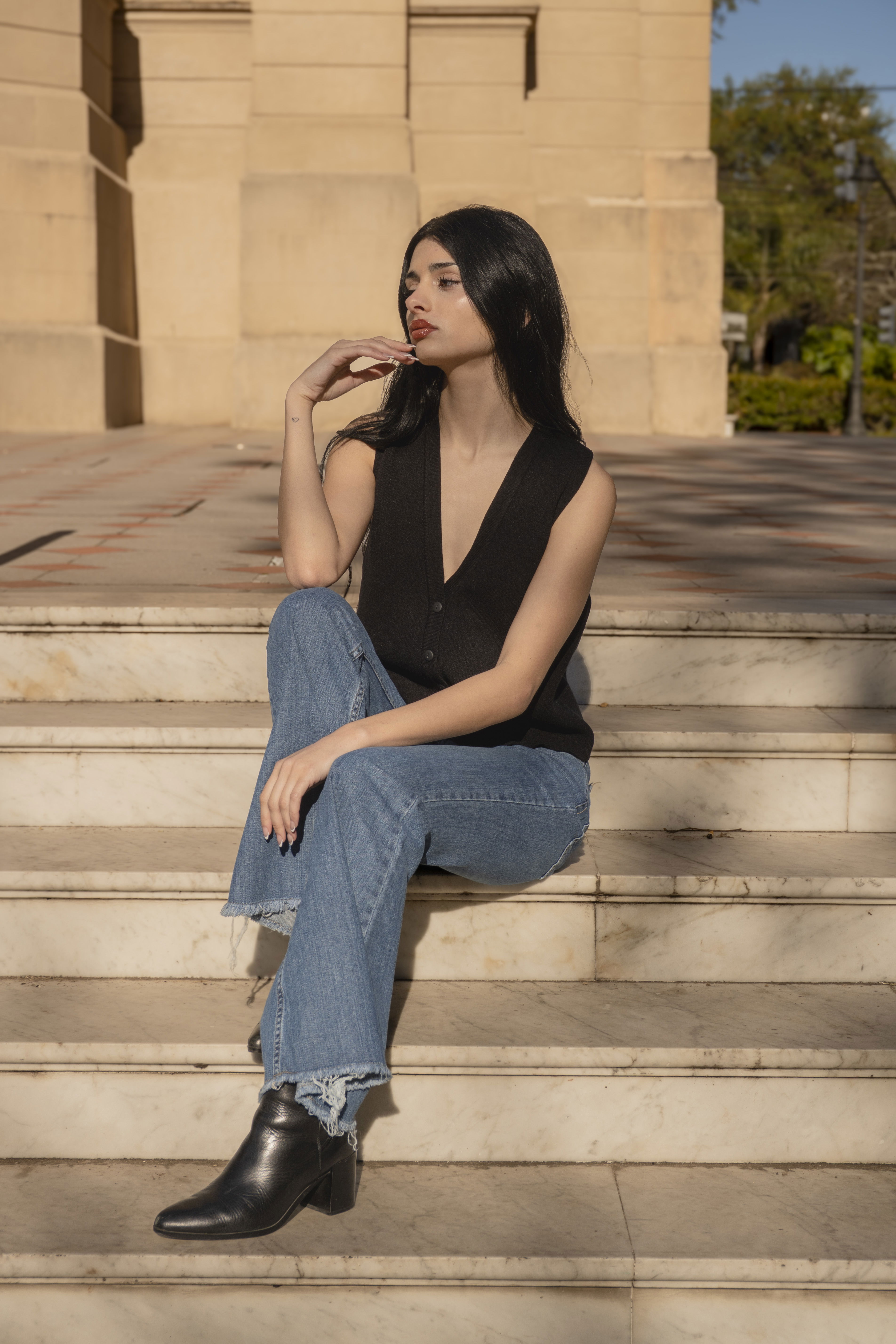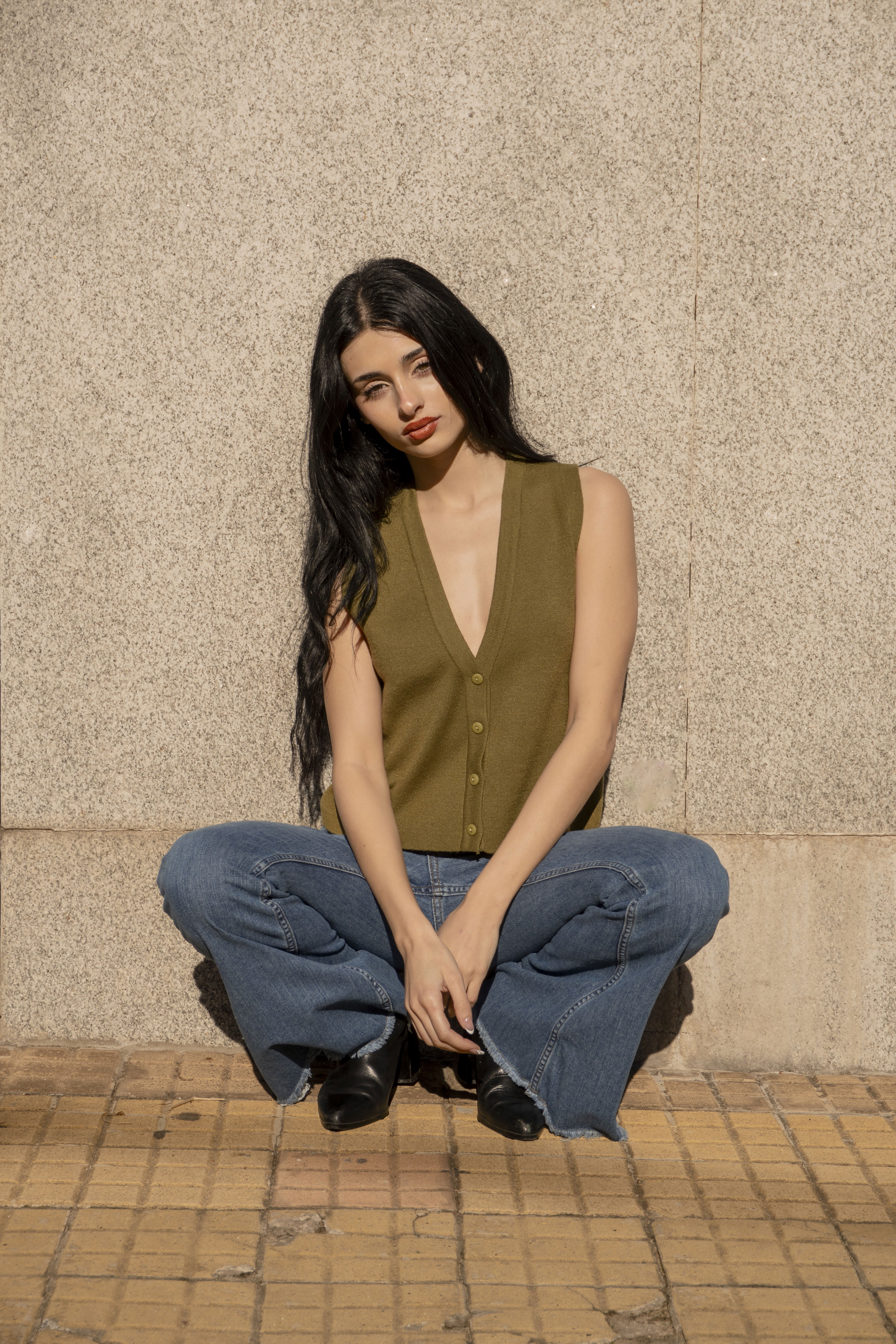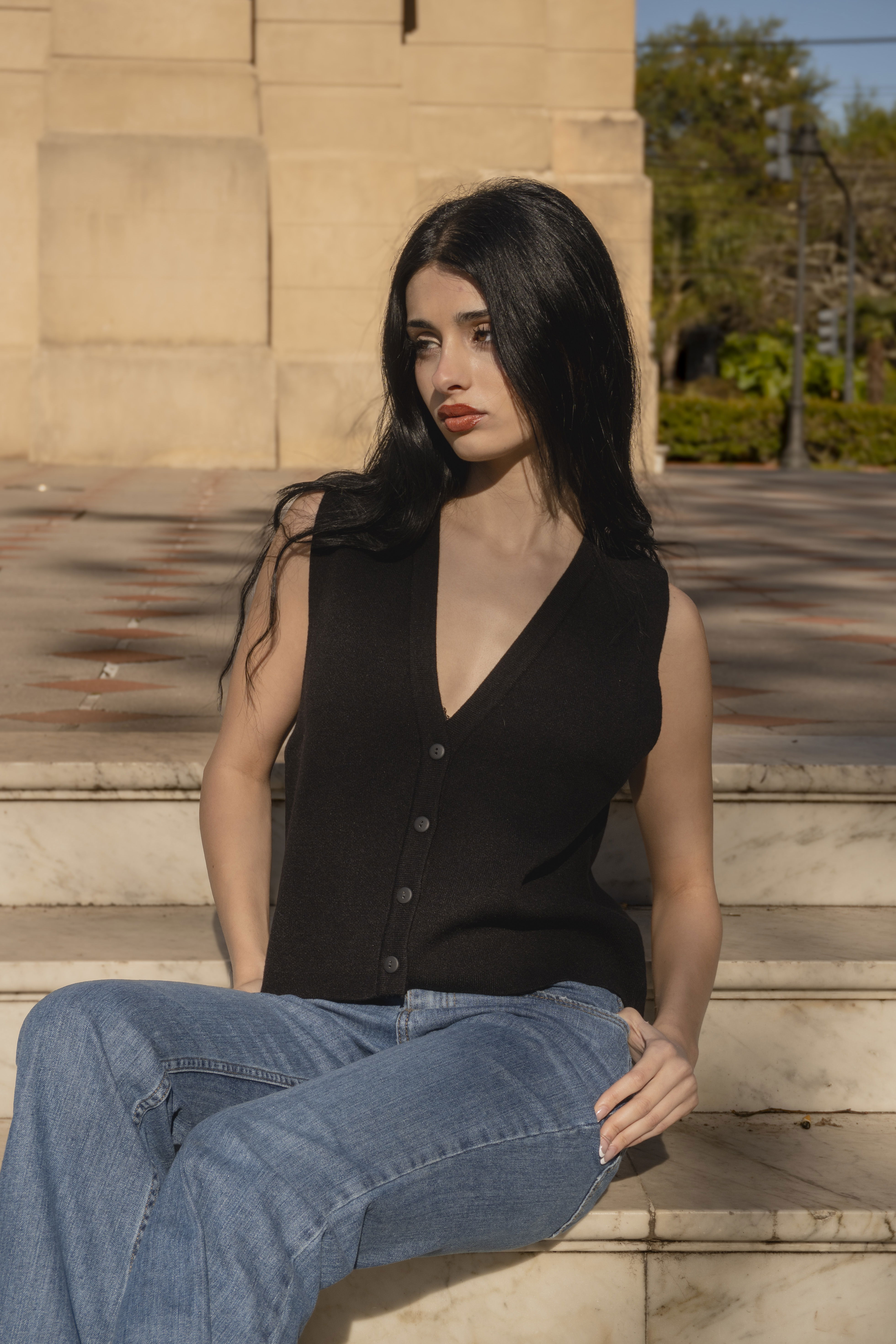 Chaleco de hilo de algodón tipo jersey elastizado, con botones a tono y cuello en V que le dan un aire elegante y atemporal. Ideal para todas las siluetas y perfecto para usar en cualquier estación. Su tejido suave y adaptable realza cualquier look con comodidad y estilo.