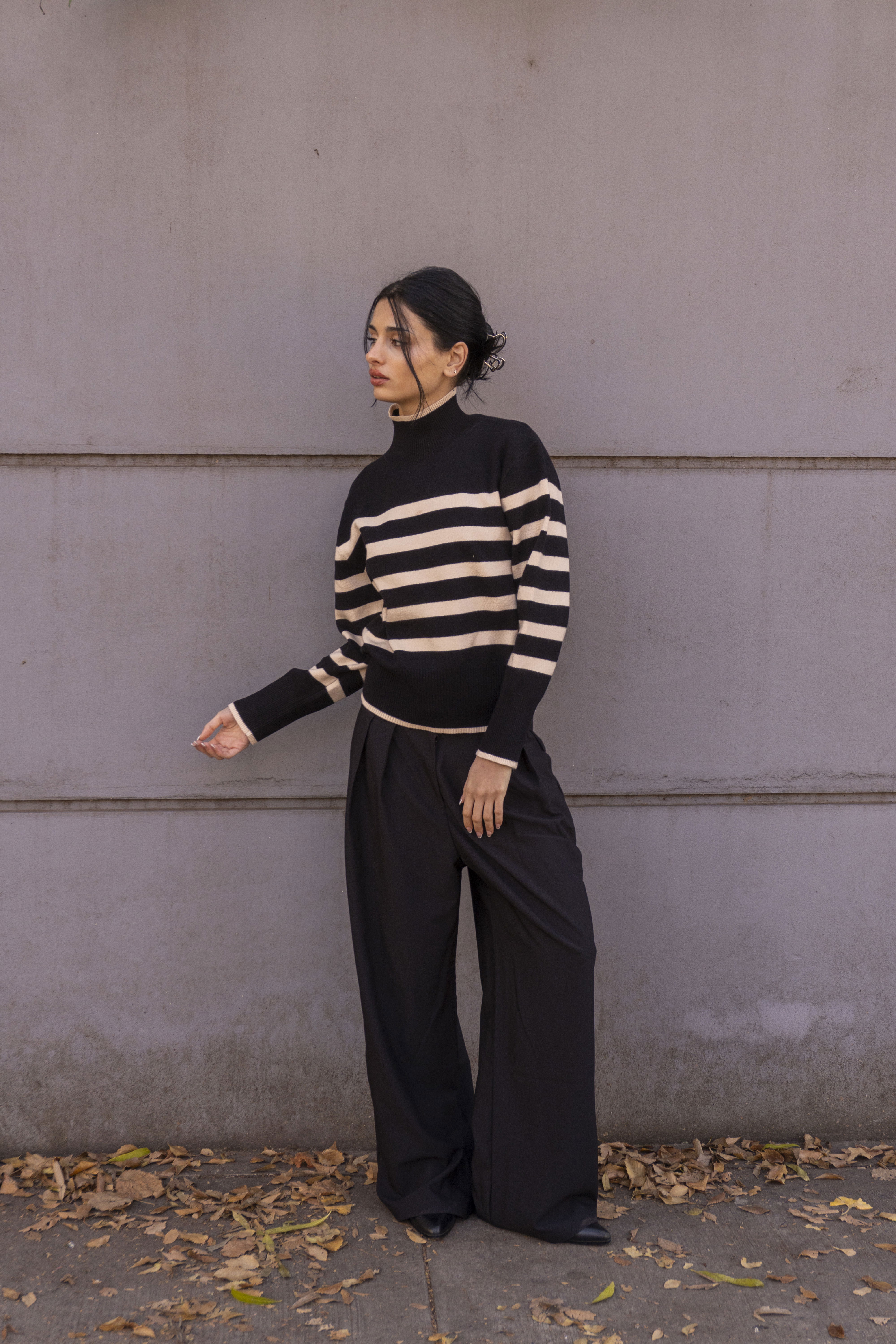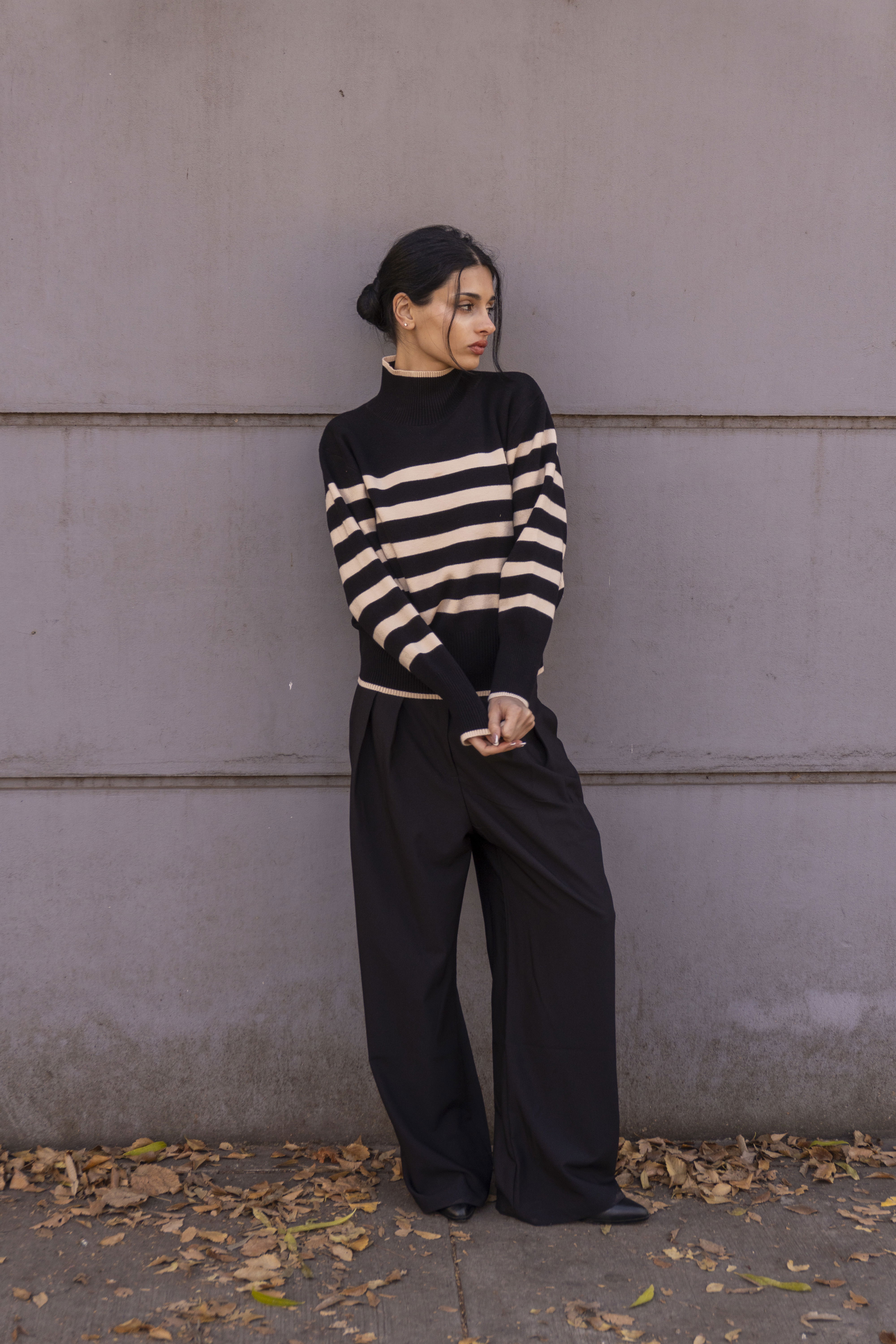 Sweater rayado de hilo de algodón elastizado importado, en combinación crema y negro. Con cuello alto y puños a tono, es suave, cómodo y con un toque clásico que eleva cualquier look.